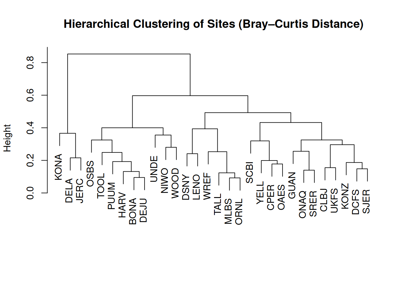main = "Hierarchical Clustering of Sites (Bray–Curtis Distance)",