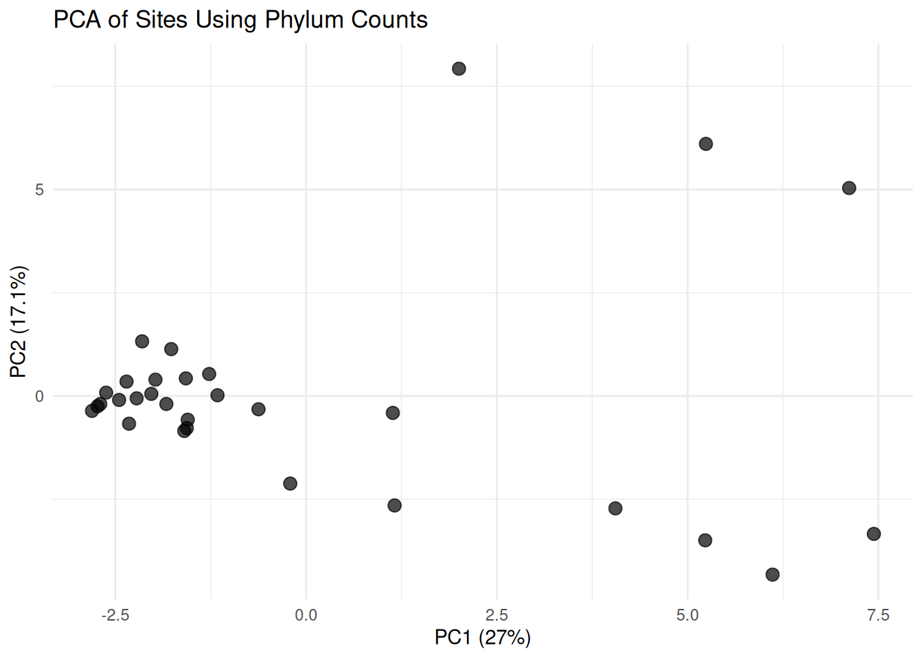 ggtitle("PCA of Sites Using Phylum Counts") +