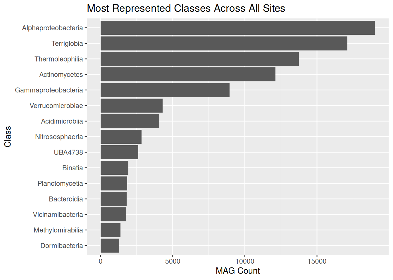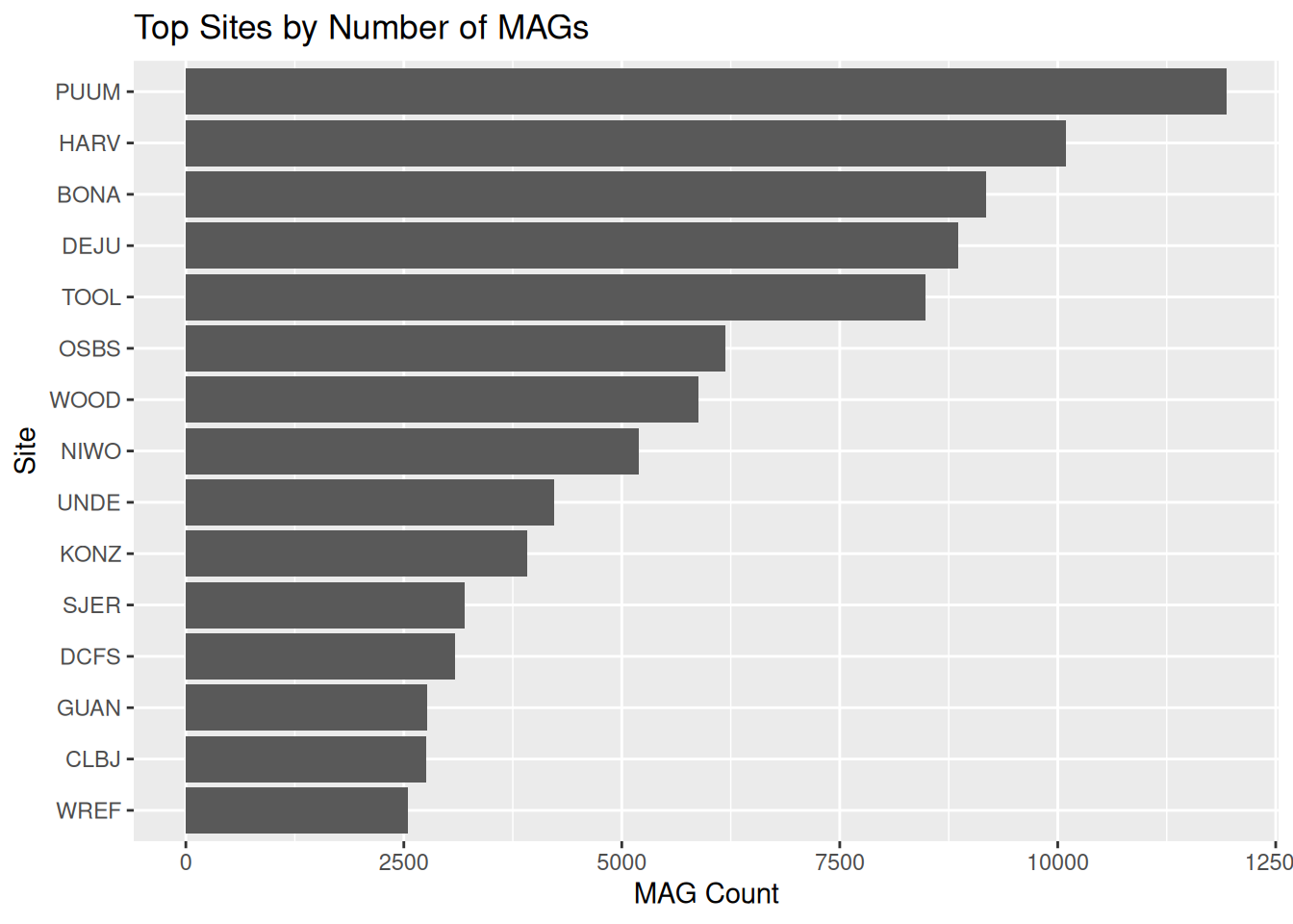 Counting MAGs per site illustrates sampling depth differences and general variation in recovered genome counts.