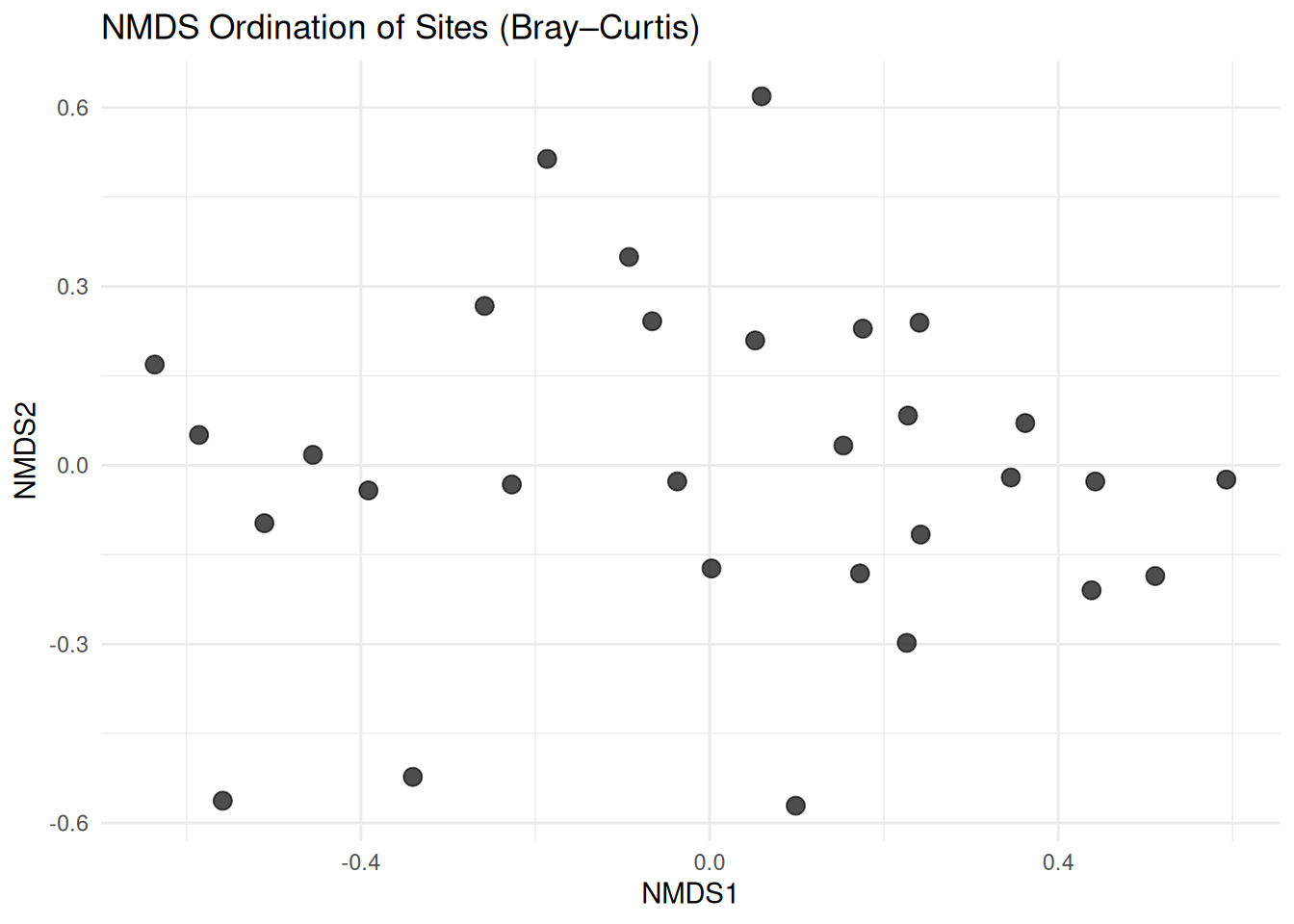 ggtitle("NMDS Ordination of Sites (Bray–Curtis)") +