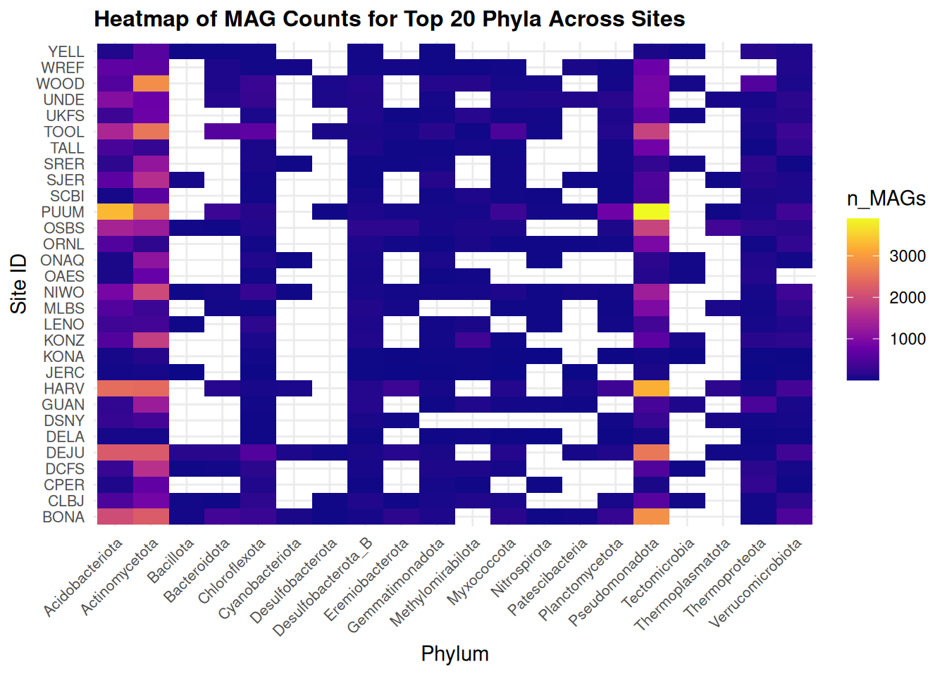 ggtitle("Heatmap of MAG Counts for Top 20 Phyla Across Sites") +